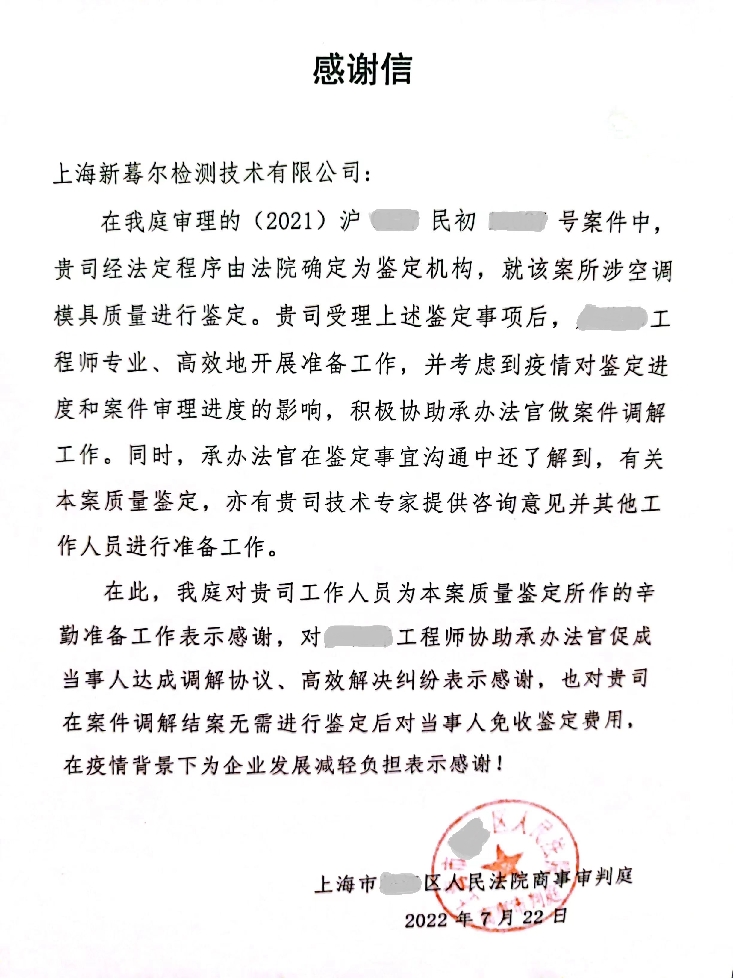 上海新蓦尔检测技术有限公司(天纵鉴定,SKYLABS)近日收到上海某法院的感谢信函,在此函件中,法院对我司工作人员在案件鉴定工作中专业及高效的表现给予了充分肯定。同时,承办法院对我司能设身处地的为申被双方着想,考虑到疫情对相关行业运营造成的严重困难,积极协助承办法官促成了案件的圆满调解,并在案件调解成功后免予了全部费用,对此行为法院予以了由衷的赞赏和感谢。